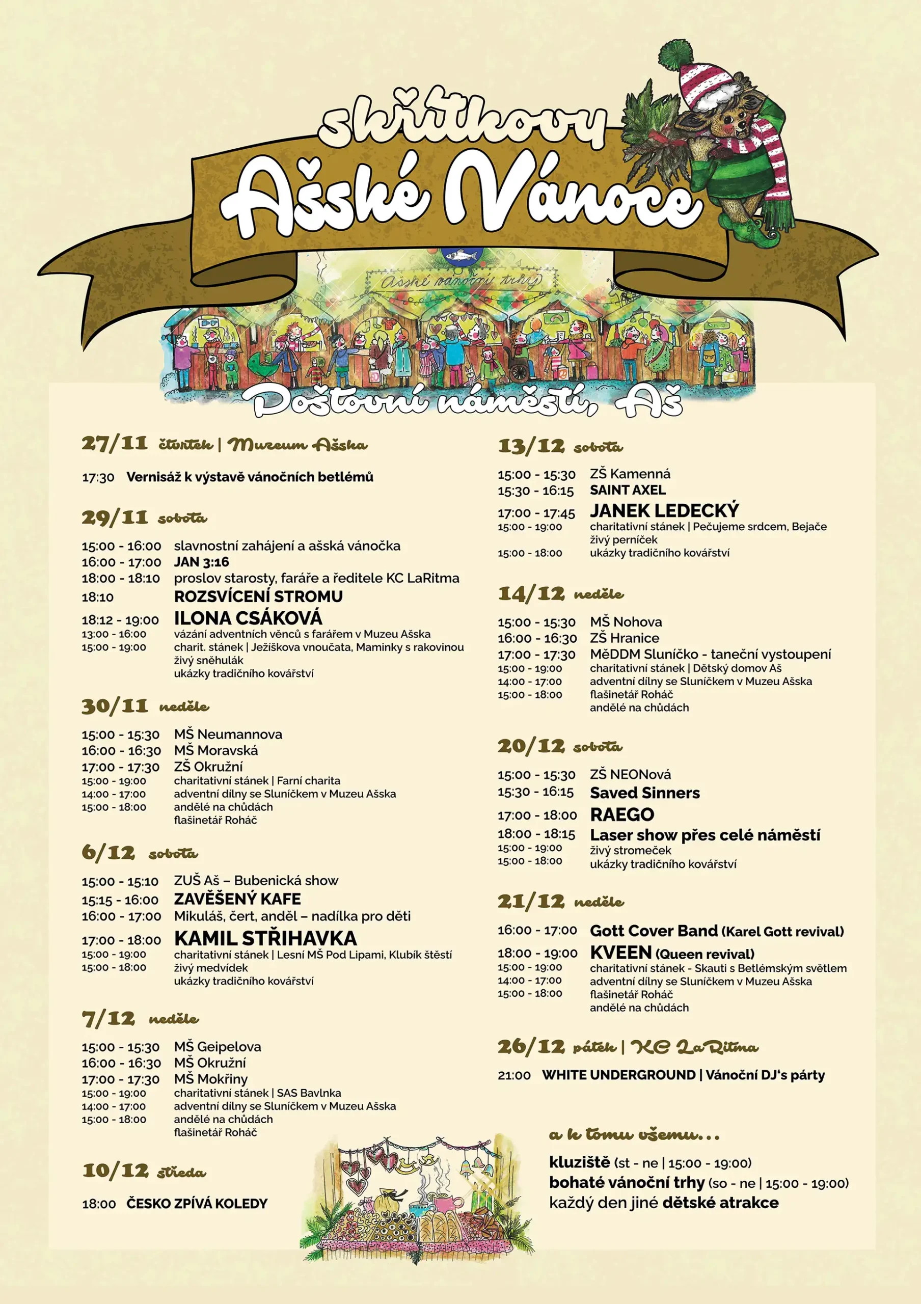 Přijďte si užít Skřítkovy Ašské Vánoce na Poštovním náměstí v Aši, kde vás čeká kouzelná vánoční nálada plná tradičních koncertů, adventních trhů a mnoha novinek. Těšit se můžete na syntetické kluziště s půjčovnou bruslí, nový Skřítkův domeček, vánoční slavobránu či cortenové ohniště k zahřátí. Každý víkend navíc podpoříte místní spolky a užijete si program se známými umělci i maskotem Skřítkem Nahřbetskočem.